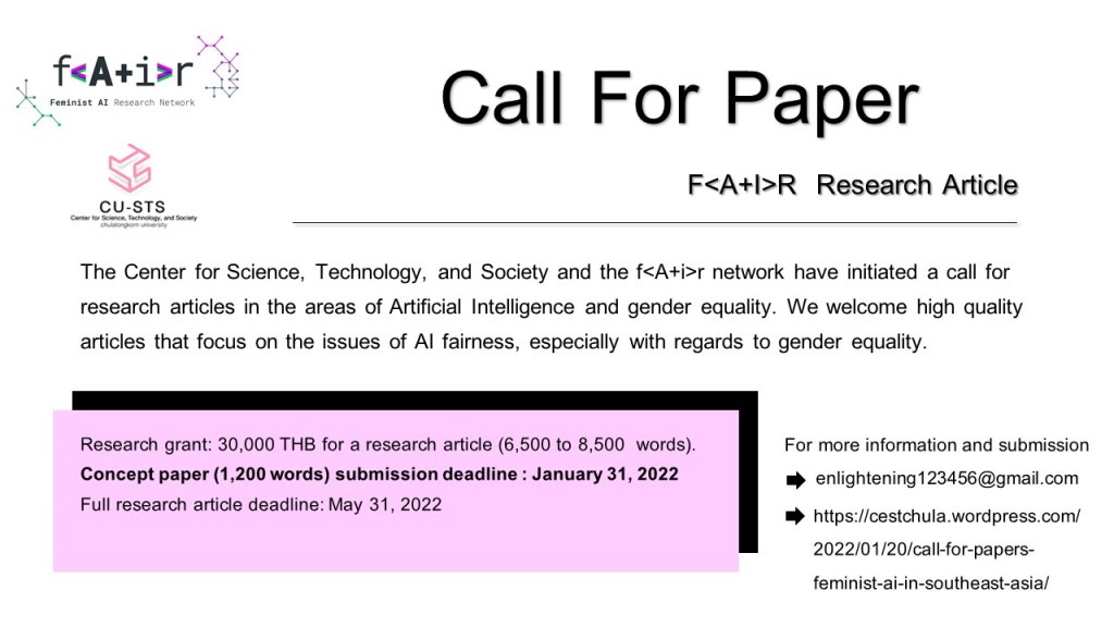 The Center for Science, Technology, and Society and the F<A+i>r network have issued a call for research articles in the areas of Artificial Intelligence and gender equality in Southeast Asia. We welcome high-quality articles that focus on the issues of AI fairness, especially gender equality. Papers will be included as chapters in an edited book on Feminist AI in Southeast Asia.