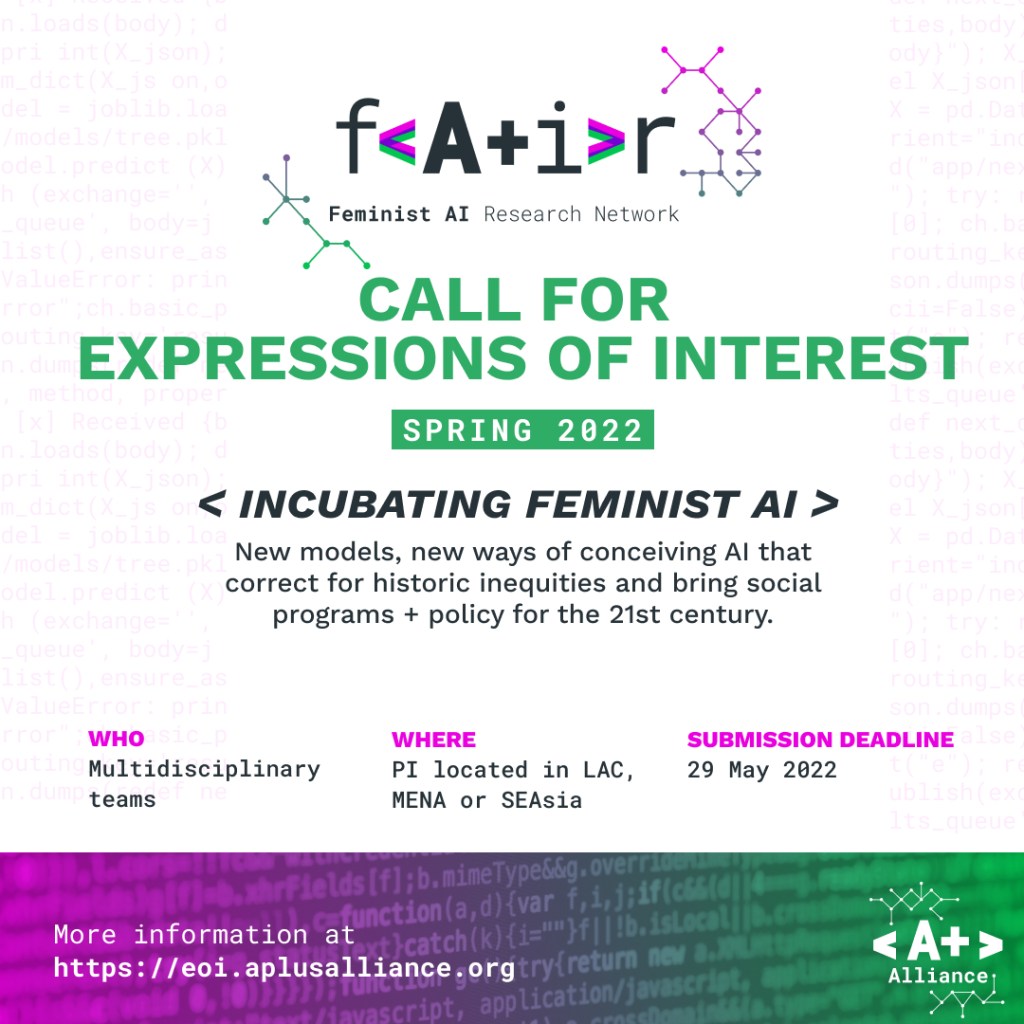 This call is released as part of the f<a+i>r feminist AI research network, supported by IDRC, in a three-year initiative to create new algorithmic and social science models that enhance social science and maching learning disciplines to intersect with core public policy agendas in the Global South. (See ANNEX 2: Indicative Research Directions and Sectors) The project will a) call for expressions of interest (current – Phase 1); b) develop a new model for publication as a research paper (Phase 2); c) prototype (Phase 3); and d) pilot (Phase 4) applied feminist AI research and solutions to ensure that technology is co-created with problem definition and solution design of affected communities, and meets or exceeds the needs of the historically marginalized or vulnerable, especially women and girls.